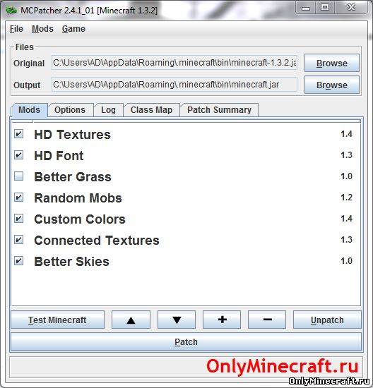 MCPatcher - Дает возможность любому игроку, которому надоели стандартные текстуры, установить любые новые текстуры. С MCPatcher Minecraft вам не придется возится долгое время с установкой текстур, вам всего лишь нужно нажать на пару кнопок и ваши новые текстуры будут установлены на ваш клиент Minecraft.