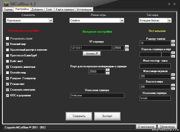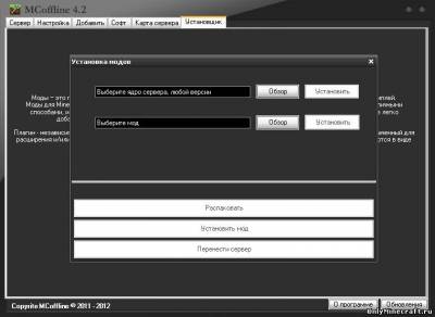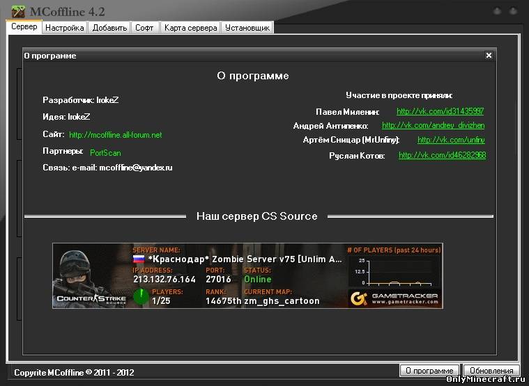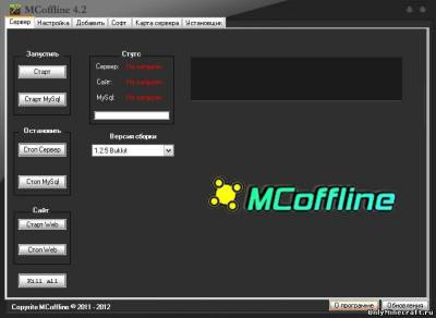 MCoffline - программа для создания и запуска сервера в Minecraft, С этой прогой вы сможете с легкостью и без проблем создать, настроить и запустить сервер Minecraft (Bukkit). Здесь можно найти все необходимое для настройки сервера. MCoffline поможет запустить сервер без лишних манипуляции или просто тем кому создать свой сервер трудно. Главная цель этого проекта направлена на простоту запуска и настройки серверов minecraft. Проект направлен на то, что бы запустить на одном компьютере сервер и поиграть на нем же.