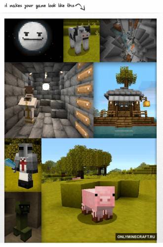Интересное название даёт не только шаблонное впечатление, но и даёт понять, что пак будет хорошим. И действительно, данные текстуры захватывают по уши и с головой. Здесь небольшое разрешение, а именно 16 на 16, но это не даёт повода закрывать страницу и искать другой пак. Вы только посмотрите на данные скриншоты, на которых милые мордашки животных, оригинальная луна, неплохой вид лавы, даже трава имеет вид, который не режет глаза, как это делают другие текстуры. Так что скачайте, не пожалеете!