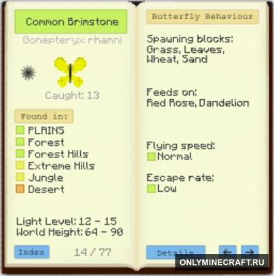 Всем привет, уважаемые пользователи, гости и друзья сайта. Мы предлагаем скачать довольно милы мод, который добавит в игру кучу разнообразных бабочек, которые есть в реальной жизни. В вашем мире вы встретитесь и с капустницей, и с Семейством Морфид и многими другими видами. Тут их более 60 штук. Вы только подумайте! 60 разных бабочек теперь у вас в игре!? Это вроде кажется мелочь, но ппц как круто! Но самое наверное главное, то что у вас появляется возможность как в жизни их ловить. И так можно собрать целую коллекцию. Если в реальном мире убивать живое существо это грех, тов игре вам за это ни чего не будет, но вот даже и в игре то порой жалко становится. Будьте аккуратны и любите этот мир! Приятной игры!
