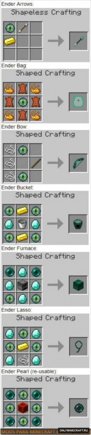 Всем хай, уважаемы гости сайта. Сегодня мы расскажем вам о потрясающем моде, который славится своими возможностями, но и простотой. Вы только представьте, что теперь у вас будут некоторые предметы от самого Эндера, а значит они могут обладать примерно такими же способностями. ну вот например, в руках у вас стрела, вы ударяете любого моба, а того телепортирует в другое место, радиусом в 10 блоков примерно. Это не далеко, не спорим, но чтобы от вас отстали на мгновенье, это очень даже достаточно, и к тому же в пещерах это самое оно. Из-за генерации его может телепортнуть в другой тоннель, или вообще в блоки, мало ли лаг был. так что качайте на здоровье мод, он вам пригодится. Приятной игры и удачи вам! Всем алмазов, да побольше!