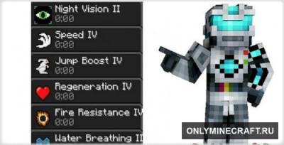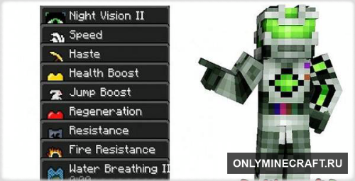 Всем доброе времени суток, уважаемые гости и пользователи сайта. Вы сейчас попали на наш сайт не случайно, а для того, чтобы скачать данную модификацию, которая добавит немного будущего в игру. Во первых это новые крутые костюмы. Крутые они не потому что они круто выглядят (это тоже, но...), а то, что они приносят вам много разных эффектов! И они не простые (не как обычно прыгучесть да скорость), а очень полезные, типа дыхание под водой, регенерация, ночное виденье, те самый скорость и прыжки, повышенная защита и т.д. Эти костюмы вам очень помогут. Ах да, давайте вообще взглянем на это чудо техники: