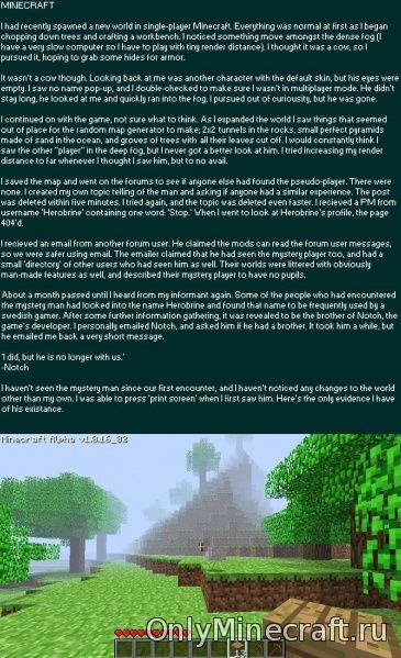У игрока, рассказавшего эту историю, появилось ощущение что он всё время видит далеко впереди другого крафтера, но приблизиться к нему у него так и не вышло. Общение с форумчанами показало, что Херобрина видел не только он. Вскоре пришло сообщение от пользователя, именовавшегося «Херобрин», с рекомендацией (или угрозой?) остановиться. Попытка связаться с таинственным форумчанином ни к чему не привела – система «порадовала» ошибкой 404. Сбор информации, последовавший за этими событиями, привёл к удивительному выводу – отправитель рекомендательного письма был братом Нотча, создателя Minecraft! Это какой-то триллер. Однако Нотч сообщил, что это всё фейк: ни призрака в игре, ни брата у него нет. Что это, запутывание следов? Это белое пятно, которое ещё много голов сломает.