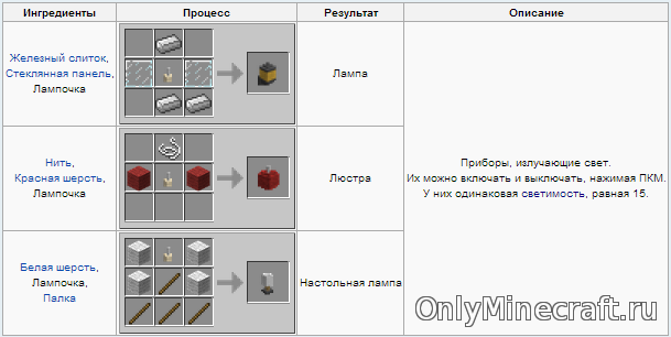 В этот мод Minecraft входит не только мебель, но и осветительные приборы, а также бытовая техника (разве это не аргумент, чтобы скачать дополнение?). Несущие свет приборы такие: