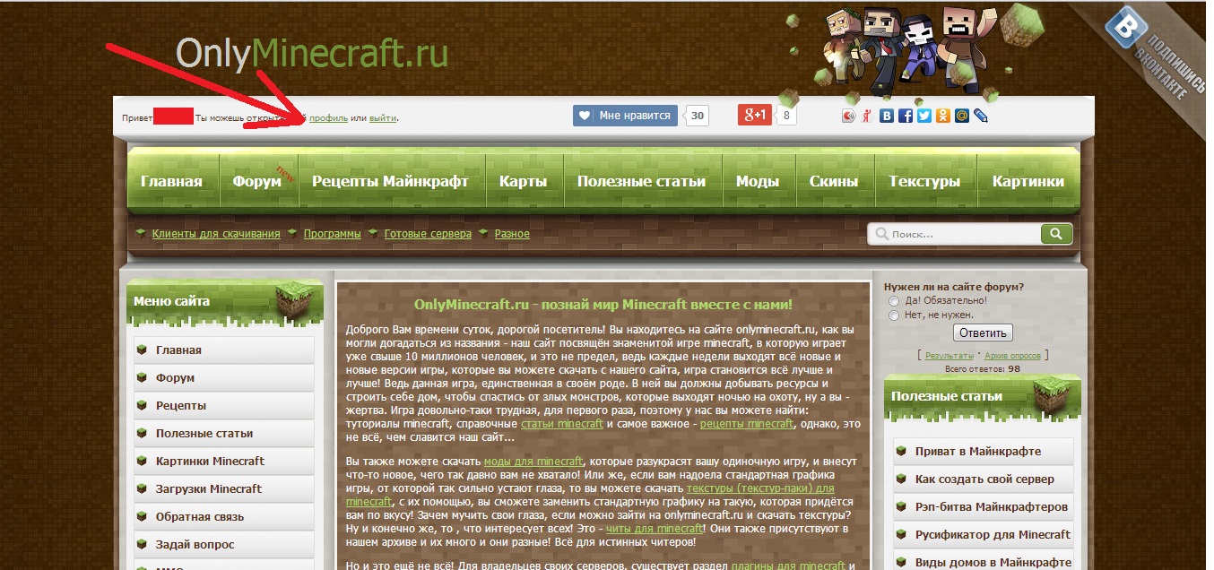 1. Жмем на ссылку "профиль" (в верхней серой полоске, над меню, мелкий шрифт, зеленый цвет)