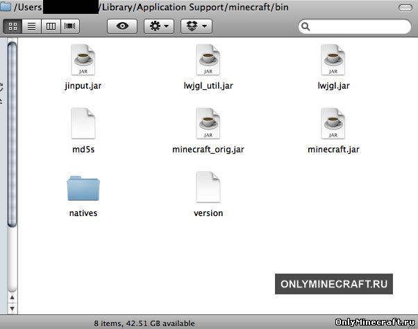 - Зайдите в директорию «minecraft» и попрощайтесь с файлом «minecraft.jar», выбросив его в корзину.