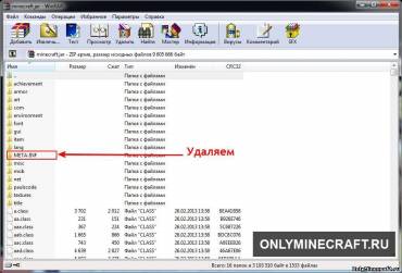 - В minecraft.jar отыщите папку META-INF и без сожаления удалите её, поскольку она любит «совать нос» в работу большинства дополнений Майнкрафт и установка мода может стать невозможной.