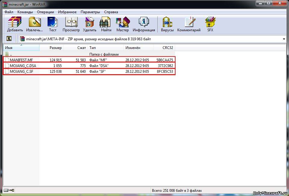 Каталог мета-информации или же как многие привыкли его называть «папки META-INF» непосредственно содержит в себе информацию об игре, зашифрованную в цифровом коде. Именно этот момент является очень примечательным для данного каталога мета-информации, ведь то, что его нужно непременно удалять или же заменять, является обязательным действием для всех крафтеров. Причиной такому действию, является то, что если данный каталог не удалить, то при проверки контрольных сумм – цифрового сертификата: CODESIGN.RSA, CODESIGN.SF и MANIFEST.MF может возникнуть конфликт с Java.