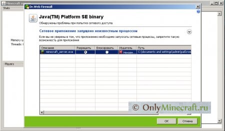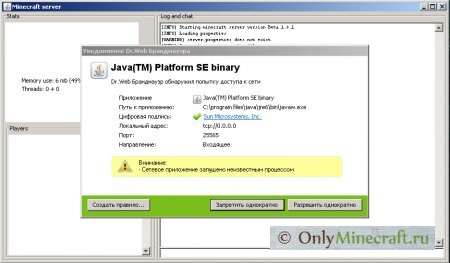 Другой случай будет тогда, если у вас для minecraft закрыт порт, или работу Minecraft_Server.exe или Java блокирует некая программа, например файрволл, как показано на картинке ниже. Если же такое происходит попробуйте удалить java и установить заново, вылезет сообщение с фаерволла и нужно будет разрешить приложению доступы.