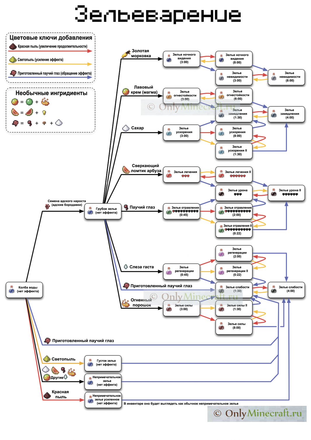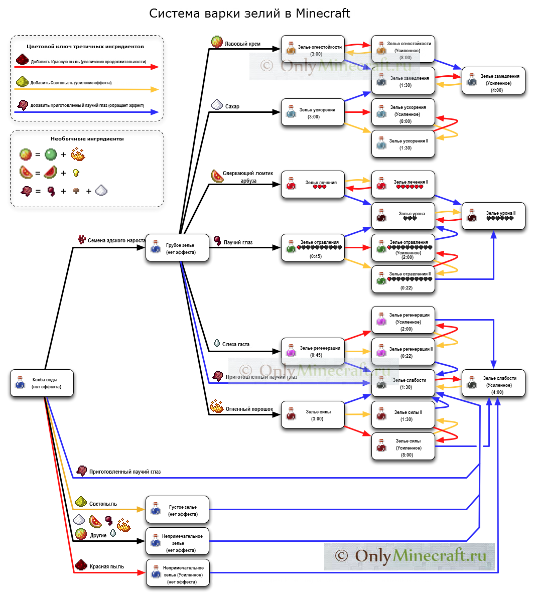 В игре существует множество рецептов крафта, который дадут вам невероятные способности, о которых вы может даже не догадывались. Множество зелей можно приготовить из обыденных вещей, которые вам может быть понадобятся.Зельеварением можно назвать как часть профессии игрока в майнкрафт. Оно обеспечит вам зелье невидимости, силы, слабости, регенерации и многое другое. Каждый вид отличается от других, потому что обладает уникальными качествами, которые некоторых игрокам, несомненно, понравится. Самые основные качества вы можете найти на странице ниже.