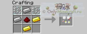 Затем нам нужно сделать навигационный прибор для управления нашим судном. Он будет показывать скорость и что еще важнее, направление. С ним мы смело можем отправляться в дальнее плавание в Майнкрафте без опасения потерять путь назад. Для крафта нам нужно иметь два слитка железа, столько же золота, два стекла и красный камень (или же редстоун: можно добыть железной или алмазной киркой из недр в мире майнкрафт). Расположим все это на верстаке так, как на фото ниже: