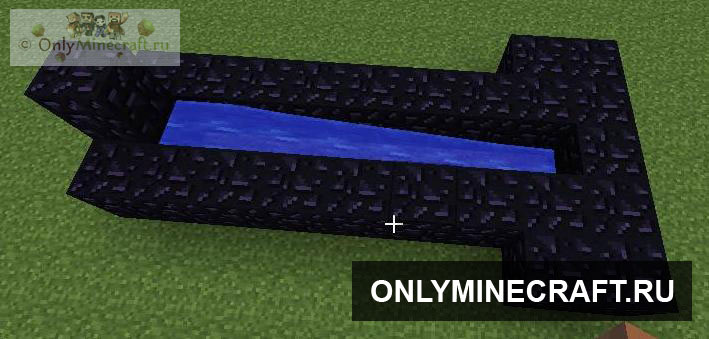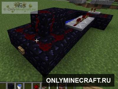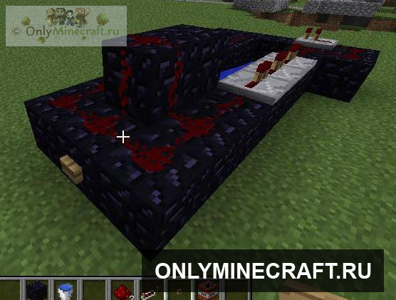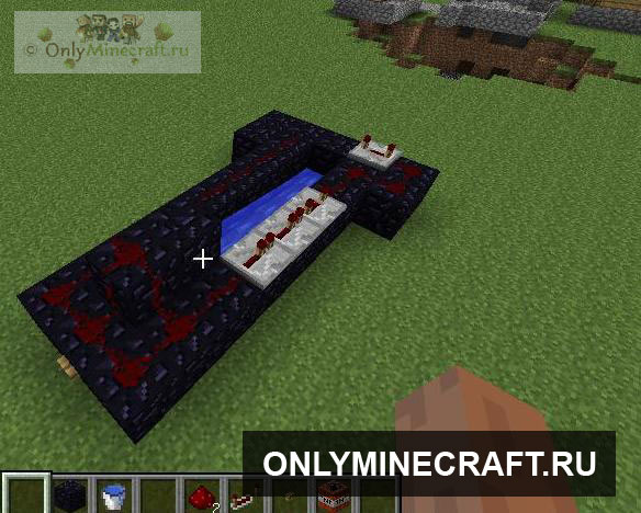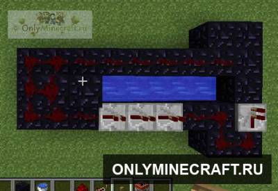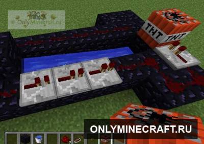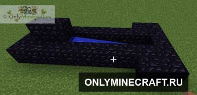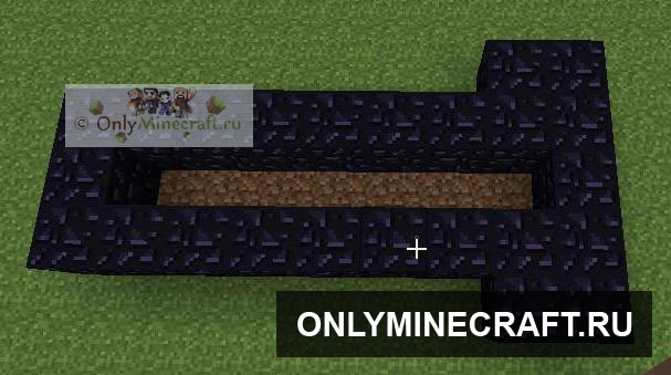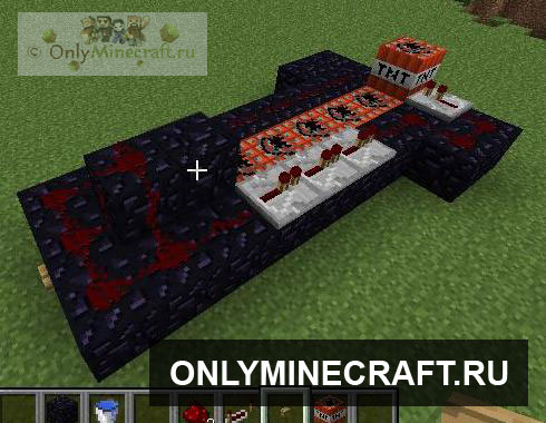 Итак, на выбранном участке, надо построить подобную конструкцию из блоков обсидиана: это будет самый оптимальный вариант. Можно использовать также и другие твердые блоки. В длину ставим девять блоков, Получается нечто, похожее на букву Т: одна сторона перекладины будет нужна будет, чтобы поставить повторитель у снаряда, а другую сторону добавляем просто для симметрии, можно и не добавлять: