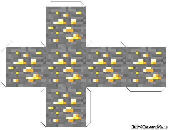 - Золотая руда. Довольно редкий блок в игре, который может «зачастить» в вашем личном наборе «Бумажный Майнкрафт».