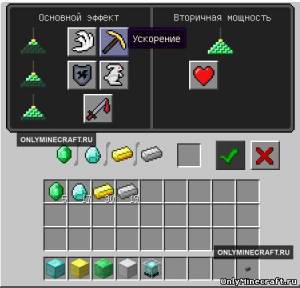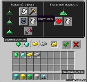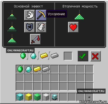 - Во-первых, открываем его окошечко, нажав на него ПкМ. Потом ставим в квадратик какой-то из данных предметов: изумруд, алмаз, золотой или железный слитки. Затем выбираем нужный из сектора основных эффектов. Он появляется в секторе вторичная мощность, рядом с сердечком. Выбираем, нажав зеленную галочку, рядом с крестиком.