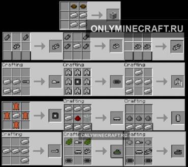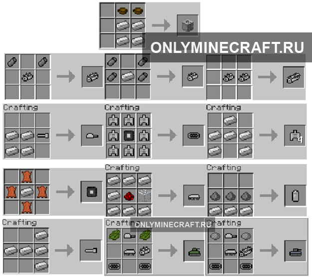 Вам также не помешает обзавестись загрузчиком модов Minecraft Forge. Он облегчит вам установку этой и других модификаций. А файл Flans Mod переместите в директорию «mods» (лучше прочитайте статью как установить мод на Майнкрафт, так будет надежнее). А теперь всё внимание на рисунок. Как и можно было ожидать, крафт танка потребует очень-очень много железа. И в этом также очень-очень много логики. Мало кто может позволить себе быть настолько отважным, чтобы построить, скажем, танк из дерева. Оставим такие эксперименты Леонардам с Давинчями. Внимание - рецепт (кликабельный!):