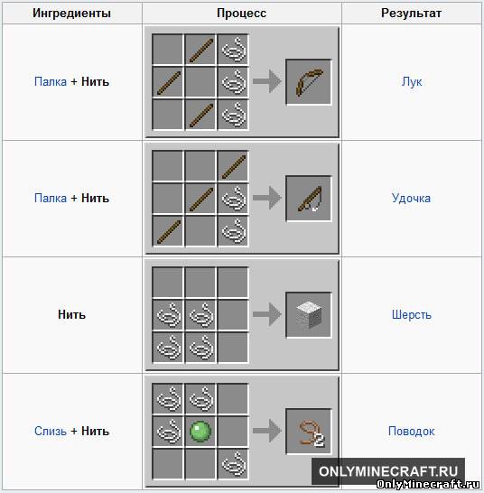 Некоторые из вас, вероятно, уже давно вопрошают, а на кой, собственно, им сдалась эта нить. Вам вполне понятно, зачем учиться крафтить дом, транспорт, всякие там лопаты, топоры, мечи… Ну а это-то зачем? Отвечаем. Не добыв нитку, вам не удастся сделать лук, скрафтить удочку, не увидеть поводка. Чтобы получить шерсть, вам также потребуется этот, на первый взгляд, не очень полезный блок. Да, шерсть «подарить» вам могут и овцы, но, согласитесь, намного лучше обладать полным арсеналом навыков, помогающих выживать в Майнкрафт. Как получить вышеупомянутые предметы, вам покажет следующая иллюстрация.
