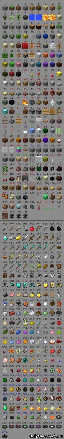 Несомненно, теперь вам яснее ясного роль нумерации предметов в Minecraft. Нумерация предметов начинается с 256. До этого в списке идут айди блоков. Такое разделение позволяет легко отличить в этом списке блоки от предметов. Выглядит это всё подобным образом: dec: 265 hex: 109, где числа указывают на то, что это железный слиток. 265 – id слитка в десятичной системе, 109 – в шестнадцатеричной.