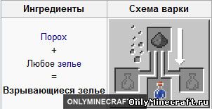 Взрывающиеся зелья – не что иное, как самые обычные зелья, в которые добавлен порох. На рисунке вы видите схему варки. В отличие от обычных, такие модернизированные зелья можно использовать в Майнкрафт, как оружие. Достаточно бросить колбу с жидкостью в неприятеля. Порох, как и любой другой дополнительный компонент, добавляется путём зельеварения, но никак не крафтом. Порох можно раздобыть в сокровищницах, но основной метод его «производства» - дроп с криперов, а также ведьм и гастов. Форма колб с этим необычным зельем отличается от формы пробирок с простыми зельями. Более всего они напоминают реторты.