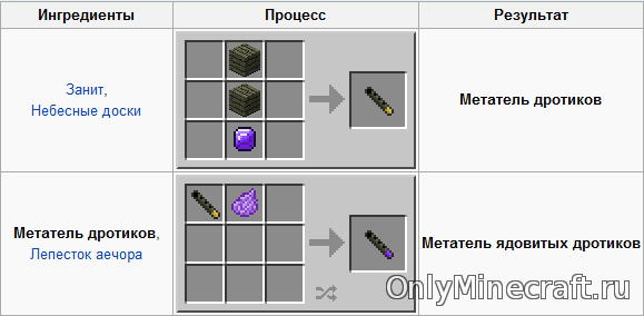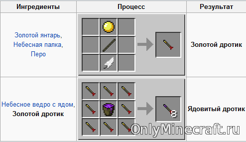 - Aether. Это райский мод, который, несмотря на вполне ожидаемое от рая пацифистское мироустройство, предполагает и крафт оружия, в том числе и д. Здесь, в отличие от других модов, копьё просто так не метнуть – нужны метатели. Как сделать их, а также сами д., вы можете увидеть на рисунках. Д. в раю Майнкрафт можно сделать золотые, ядовитые и зачарованные.