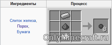 - Патроны. Чтобы на поле боя не блефовать, отправьте на верстак порох, бумагу и слиток железа. Взамен вы получите восемь снарядов.