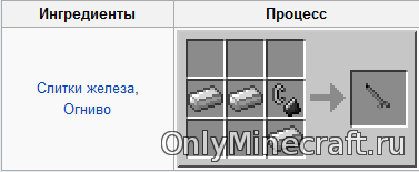 - Дуло. Для его крафта вам понадобятся огниво и железные слитки. Разместите на верстаке составляющие дула в том же порядке и количестве, что и на иллюстрации. Само по себе дуло ни на что в Майнкрафт не годно, и смысл его бытия только в дружбе с прикладом.