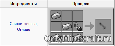 - Ствол. Чтобы сделать дуло, запаситесь четырьмя железными слитками и огнивом. Поскольку крафт огнива в Майнкрафт также требует слитка железа, всего их нужно пять штук. Зажигалку невозможно сделать без кремня, так что запаситесь и им. Сохраняйте, предложенный иллюстрацией, порядок расположения элементов на верстаке.