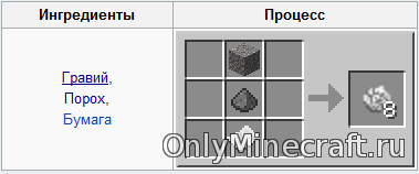 - Патроны. Если для крафта мушкетных снарядов нужны порох, бумага и железо, то, чтобы сделать дробь, потребуются всё те же бумага с порохом, но слиток железа заменит гравий. Расположите всё ваше смертоносное добро в указанном рисунком порядке, и вы станете богаче на восемь патронов.