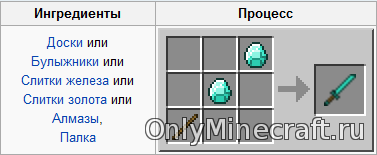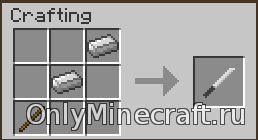 - «Balkon's Weapon Mod». Установив его, вам, чтобы сделать меч, придётся разместить на своём верстаке палку и, в зависимости от ваших пожеланий, что-либо из таких блоков: доски, алмазы, слитки золота, булыжники или слитки железа.
