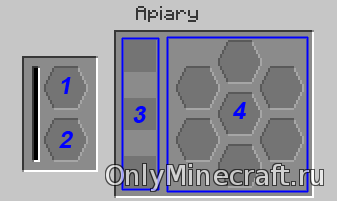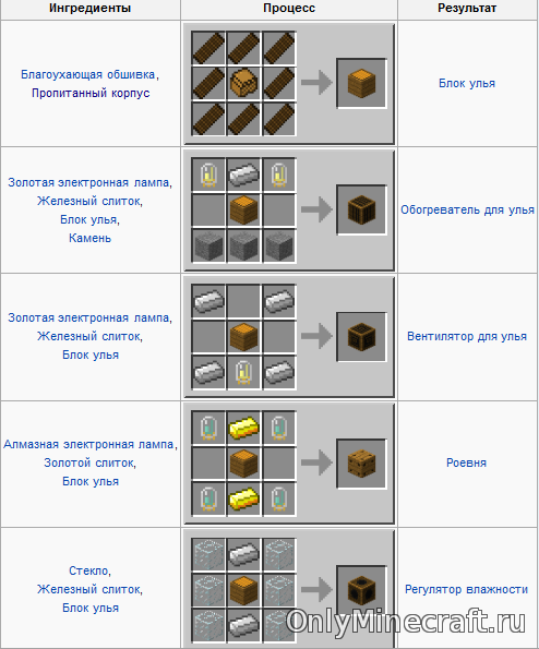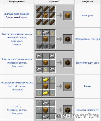 У совершенства нет границ, и освоив пасеку, пчеловод может сделать следующий шаг – крафт огромного улья. Посмотрите на рисунок. Он отображает крафт элементов, входящих в улей. Вы видите, что входит в эту конструкцию: основной блок, вентилятор, обогреватель, регулятор влажности и роевня. Эти-то элементы и отличают улей от обычной пасеки. Возможность менять температуру, проветривать конструкцию, контролировать уровень влажности очень облегчает разведение пчёлок в Minecraft. А роевня поставляет новых принцесс.
