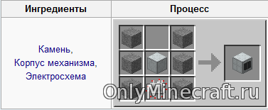 Вот компоненты, входящие в компрессор: электросхема, камень и корпус механизма. Именно их вам нужно раздобыть в Minecraft и забросить на верстак. Шесть камней и по одной единице остальных элементов будьте добры разместить в таком же порядке, в каком они расположены на представленном рисунке. С корпусом и камнями проблем у вас в Майнкрафте точно не возникнет, а с электросхемой хоть и придётся немного больше повозиться, но, в общем, сделать её тоже не затруднительно.
