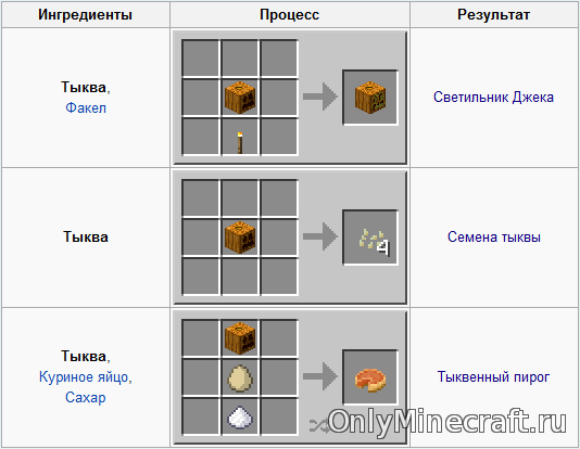 - Тыквенный пирог. Чтобы его сделать, кроме нашего овоща, нам понадобится сахар и куриное яйцо. В отличие от почти всей другой еды, пирог можно приготовить, не используя печку. Готовьте прямо в инвентаре. К тому же, пирог неплохо утоляет голод – восстанавливает восемь его единиц.