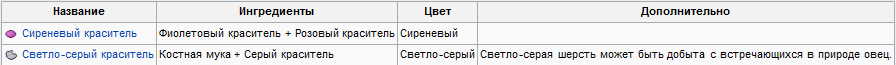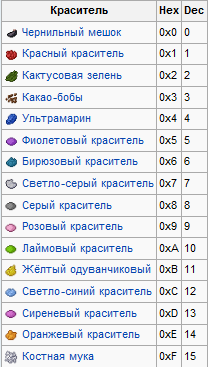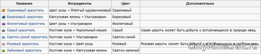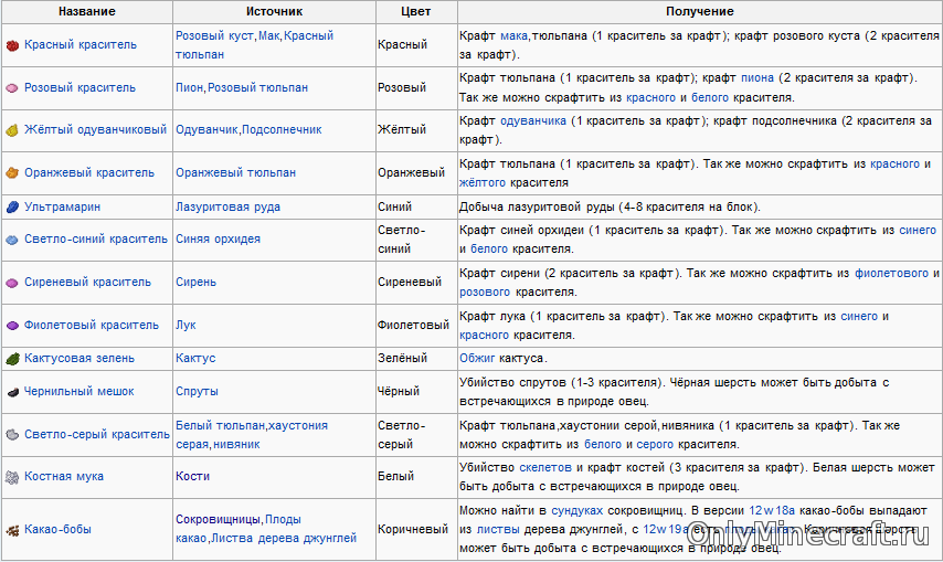 Ну а теперь подробнее о самих «пигментах». Цвета в Minecraft бывают первичные, вторичные и третичные. Вот какие есть первичные красители (их тринадцать), а также ингредиенты, из которых их можно сделать или добыть: