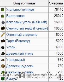 Топливом для ген. в Майнкрафт являются горючие предметы. Базовый ген. способен вырабатывать 10 еЭ/т. В таблице вы можете увидеть, насколько эффективны разные виды топлива.