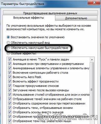 - Часто повысить FPS Minecraft помогает выбор того значения, которое вы видите на скрине. Добраться до этого окна можно, проследовав по такому пути: Компьютер→Свойства→Доп. параметры→Быстродействие→Параметры.