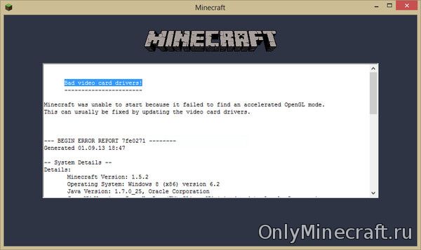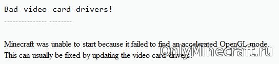 С Джавой вроде разобрались. Предположим, с этим у вас уже всё ОК, а Майнкрафт всё равно не запускается. Вы уже пробовали 7 или 70 раз, а злой рок продолжает препятствовать. Успокойтесь, вполне возможно, что рок тут ни при чём. Если выскочило окно, как на скрине, то проблема кроется в видеокарте.