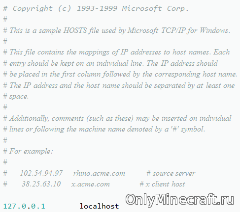 Возможно, проблема и не в системных защитниках. Тогда попробуйте проинспектировать файл «hosts». Найти его можно здесь: c:\windows\system32\drtivers\etc. Откройте его обычным Блокнотом и сравните с текстом, приведённым на скриншоте.