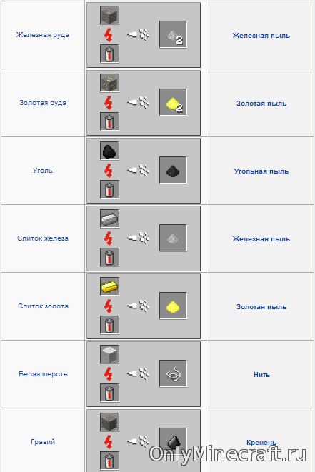 Посмотрите на рецепты. Ничего удивительного в том, что из железной руды получается железная пыль, а из золотой – соответственно, золотая. Интересней, когда из белой шерсти получается нить, из гравия – кремень, а из булыжника – песок. Как видите, есть очень много рецептов. И не забывайте, что дробитель в Майнкрафт в Industrial Craft2 требует заряженного аккумулятора.