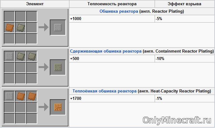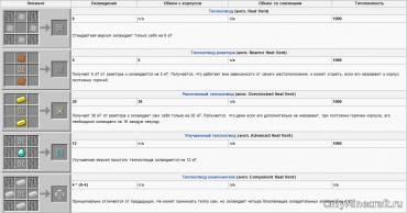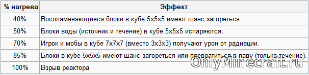 Прочность корпуса привязана к количеству того тепла, которое может хранить в Minecraft ядерный реактор. Вначале его ёмкость – 10000 еТ. Каждая камера увеличивает её на 1000 еТ, а каждая термопластина – на 100 еТ. Следующая таблица иллюстрирует эффекты, возникающие при разных степенях нагрева.