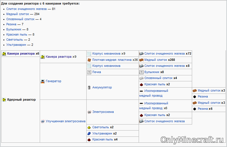 В оригинальной версии можно обходиться без свинцовых пластин. А до v. 1.106 место пластин занимал композит. Схема хорошо иллюстрирует, чего и сколько хочет от вас реактор в Minecraft.