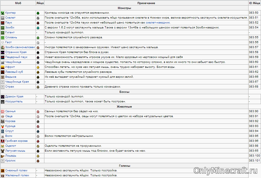 Яйца призывания – это предметы, которые позволяют игроку (в Творчестве) спаунить мобов. На Мирной сложности недружелюбные мобы не появляются. Спаунить в Майнкрафте выбранных монстров можно кликаньем ПКМ, держа в руках яйцо. Из таблицы видно, какие яйца каким мобам соответствуют.