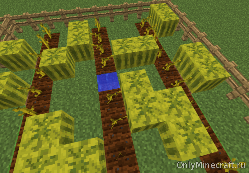 Простой способ предполагает высадку арбузов в Майнкрафт ровными рядами с блоком воды на квадрат размерами 9х9.