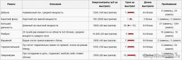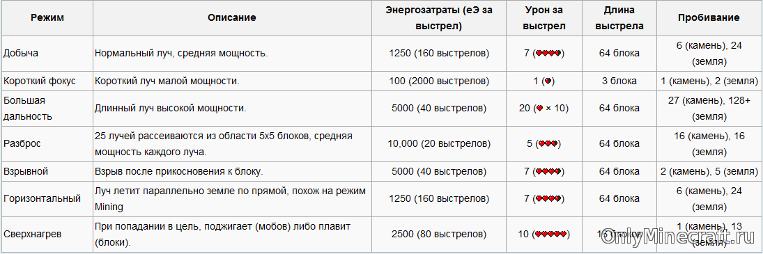 Особо интересны Horizontal и Superheat. Первый позволяет выжигать идеально ровные горизонтальные тоннели. Второй способен переплавлять материалы, позволяя не прибегать к другим приспособлениям. Заряжается «выжигатель» в МФСУ или МФЭ. Таблица демонстрирует характеристики.