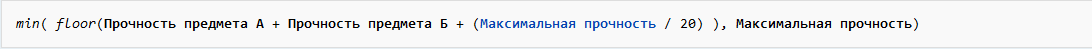 Floor – округлённое значение, min – определяет наименьшее значение. Приведём пример. У вас есть две изношенные каменные лопаты. Прочность каждой – 32, при этом максимальная крепость «снятой с конвейера» - 132. Считаем: