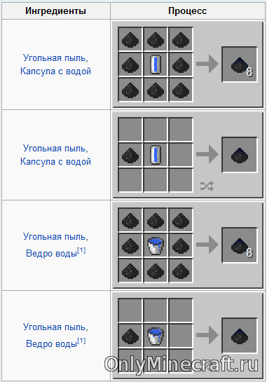 Если использовать обычную угольную пыль, то этот рецепт принесёт пять энергоносителей. Если же в Майнкрафт в «замес» добавить гидратированную, то на выходе будет восемь штук.