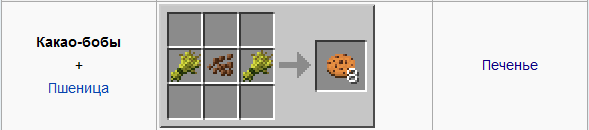 - Печенье крафтится из двух компонентов: какао-бобы и пшеницы. Два снопа зерновых и один блок какао-бобов в сумме дают восемь печенюшек. Это довольно выгодное использование тропических плодов, так как пшеницу выращивать сложнее. Плюс к этому, какао-бобами легче утолить голод. Приведём пример. Имея шесть блоков злаков, можно сделать два хлеба, которые восстановят пять единиц голода. Добавив же три какао-боба, можно съесть двадцать четыре печенья, которые прибавят те же двадцать четыре единицы. Выгода очевидна.
